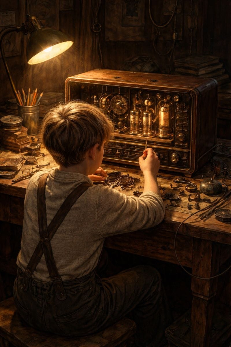 For hours, days, years, he takes radios apart and puts them back together, desperate to understand their inner workings. Jutta loves the stations he discovers, and they listen together in the attic at night.